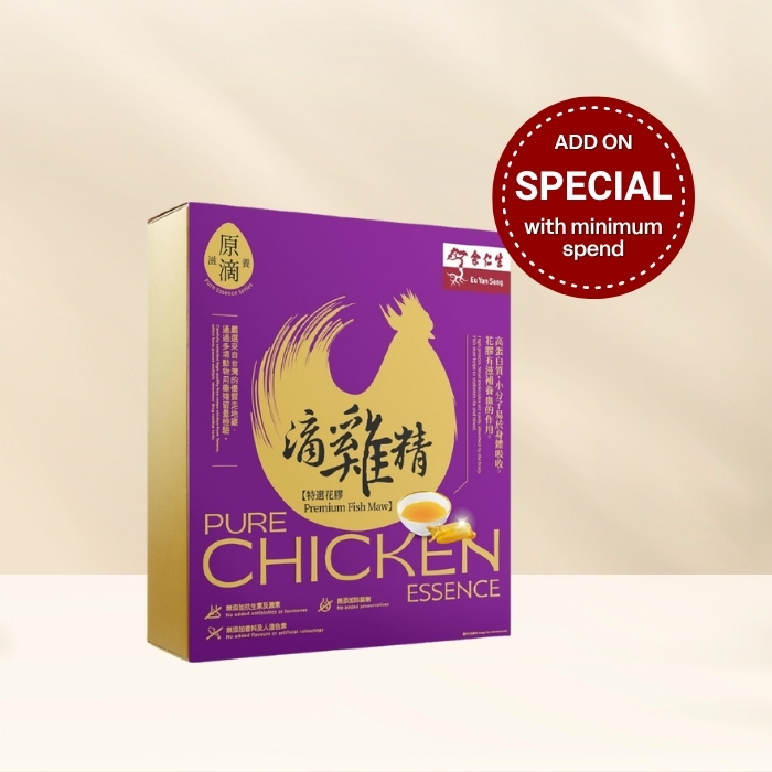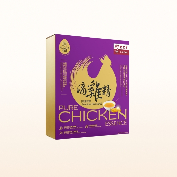 Free Range Chicken Our chickens are completely free of artificial growth hormones, antibiotics, or drugs, and have been verified to pass drug-free residue tests. Premium fish maw Fish maw helps to nourish skin, replenish yin and blood, making the skin elastic, smooth and plump; by adding Premium Fish Maw to free-range chicken, the flavour of the Pure Chicken Essence will be greatly enhanced. A natural health supplement suitable for people at all ages and at all times. No additives No antibiotics, hormones, artificial colours, flavours or preservatives were added.